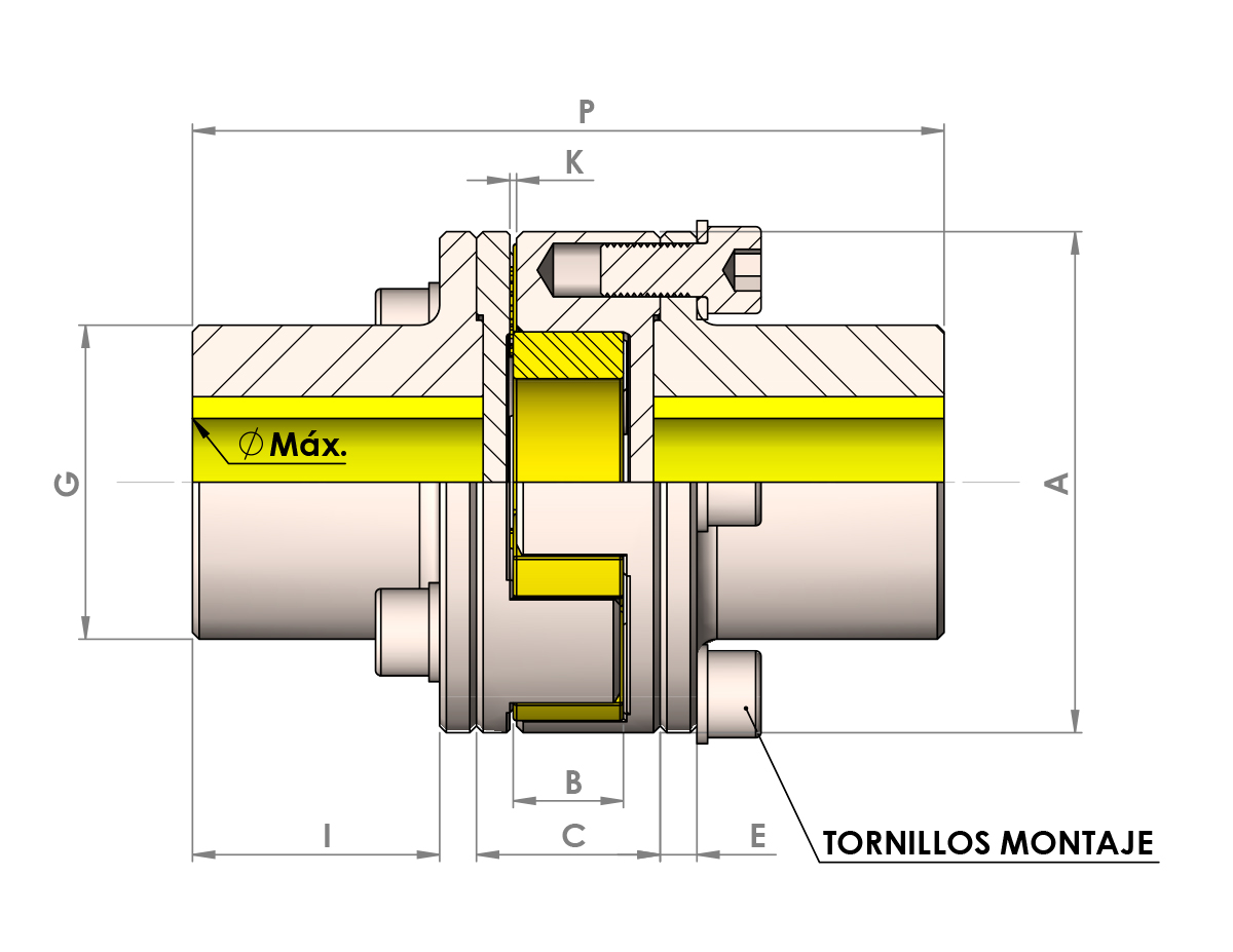 REFERENCIA | ESTRELLA A x B | MÁXIMO Ø EJES | ESTRELLA 85º ShA | ESTRELLA 90º ShA | ESTRELLA 92º ShA | ESTRELLA 96º ShA | ESTRELLA 98º ShA | ESTRELLA 64º ShD | R.P.M MÁX | P | C | G | I | E | K | Nº tornillos | Par Apriete (Nm) | PESO (kg) |